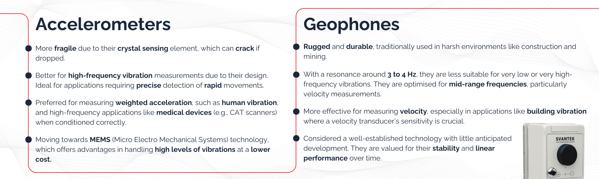 With future developments, I don’t anticipate much development happening in geophones as they are a very well established technology that has been around for years. For example, the geophone we are using in the SV 803 is a well-known type with well characterised performance, very stable and linear.