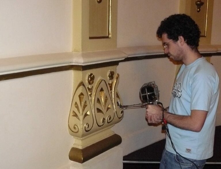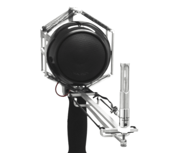 With a small, handheld impedance gun the acoustic absorption, reflection or impedance can be measured in just a few minutes, broad band and under normal and oblique angles. With a sound source at 23cm from the probe, noise is generated towards the sample. The impedance gun is equipped with a system designed to decouple the sensors from structure born vibration generated by the spherical loudspeaker. The sound pressure and acoustic particle velocity are measured directly on the surface of the material. The absorption & reflection coefficient can be obtained directly from the measured impedance as the complex ratio of sound pressure to particle velocity.