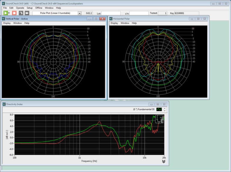 SoundCheck measures a device’s directional characteristics by acquiring data at different angles either manually or via an automated turntable. Directional data can then be displayed on a polar plot and used to calculate the directivity index.