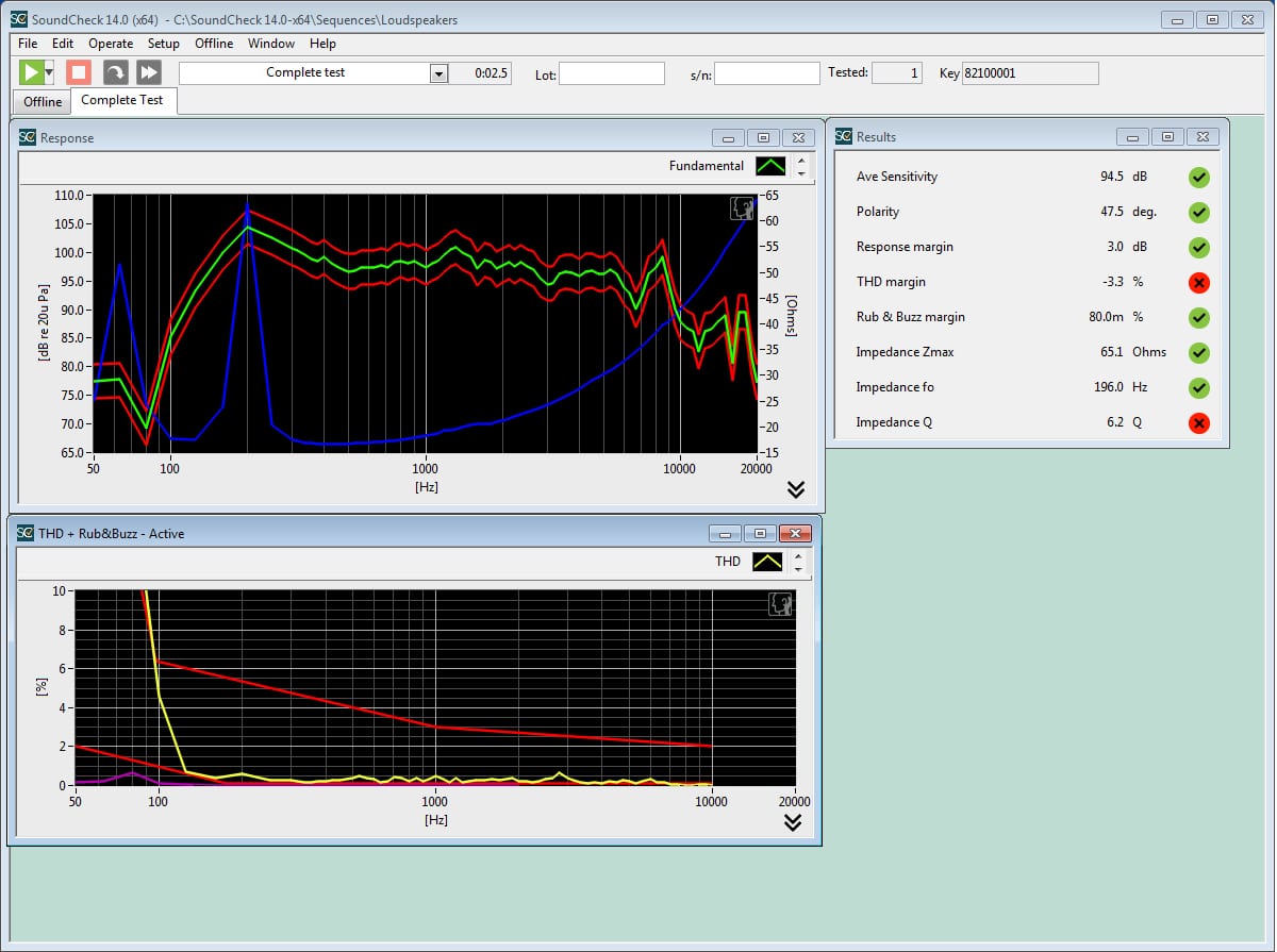 SoundCheck features pre-programmed Thiele-Small equations and test sequences for the three commonly-used methods: added mass, known volume and known driver mass. A simple curve fit algorithm automatically extracts the F0, Q and Z-max values, and the standard Thiele-Small equation can be adapted using the post-processing equation editor for analysis using different models