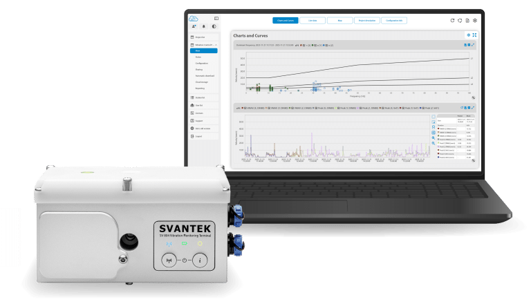 The SV 804 provides fully automated, remote vibration monitoring with real-time alerts via SMS and email. The system automatically detects vibration events based on PPV thresholds and dominant frequency analysis, reducing the need for manual intervention. Measurement data is stored securely in the device and synchronized with the SvanNET cloud platform, where users can access detailed reports, event logs, and diagnostic insights anytime, anywhere.