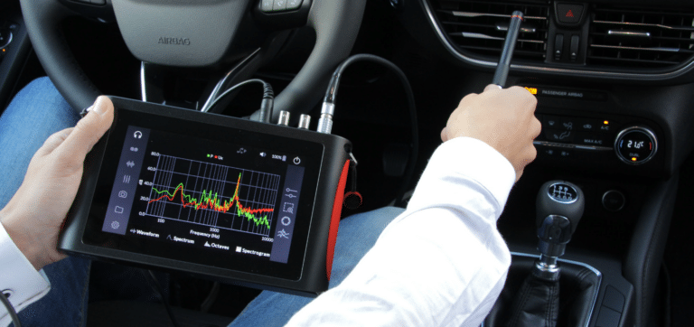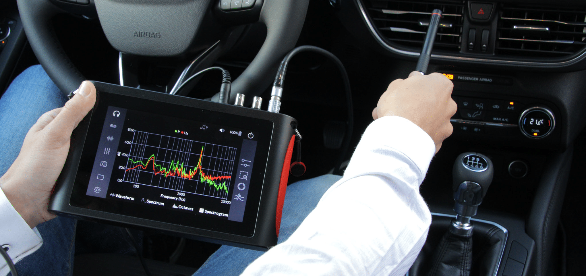 The Microflown Voyager is a portable all-in-one device that merges multiple functional units like data acquisition, signal conditioning and storage into a powerful NVH unit ideal for vibro-acoustic data recording, visualisation and analysis.