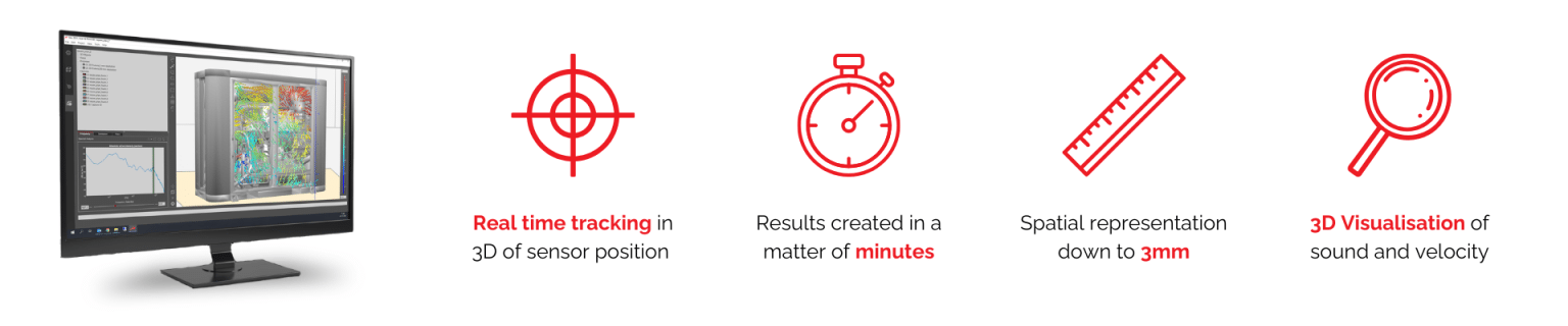 | Visualisation | Acoustic heatmap on photo | Sound intensity mapped on 3D model |