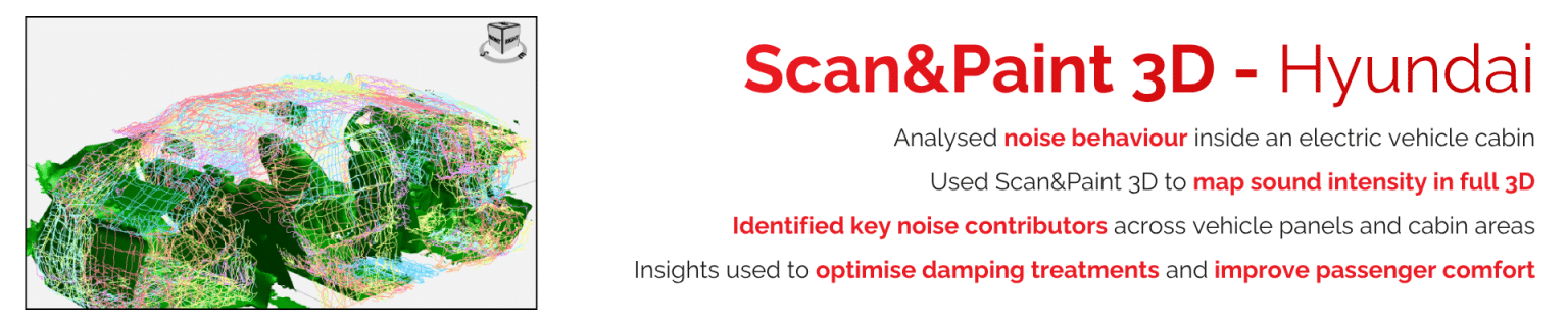 Hyundai Motor Company used Scan&Paint 3D to study acoustic behaviour inside an electric vehicle cabin. By mapping the sound field in three dimensions, engineers could identify which parts of the vehicle structure were contributing most to interior noise, helping them optimise damping treatments and improve passenger comfort.
