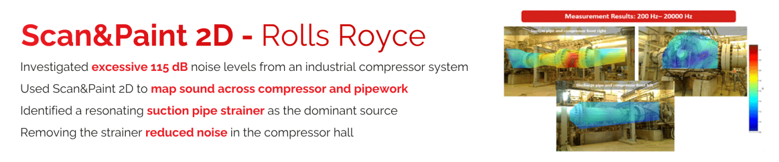In a project with Rolls‑Royce, engineers used Scan&Paint 2D to investigate excessive noise levels (around 115 dB) from a large industrial gas compressor system. By scanning different sections of the compressor and pipework, the team was able to identify a single dominant noise source within a suction pipe strainer, which was resonating during operation. Once the strainer was removed, the overall noise level in the compressor hall dropped to an acceptable level.